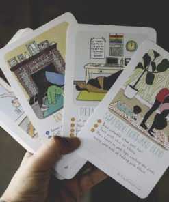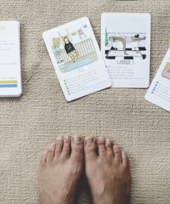 Created by Nicole Landry (Founder, Oh Mother Care Kits) in collaboration with Katrina Crowson (Hatha Yoga Instructor/Owner at YogaInTheWorkplace.ca) and Jill Jackson (Illustrator at Jill + Jack Paper). These three East Coast gals came together to create fun and friendly yoga visuals that depict real women’s lives and bodies.